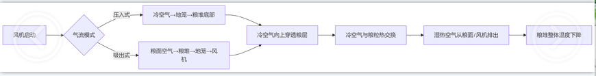 通風(fēng)地籠網(wǎng)狀布局使得氣流覆蓋整個(gè)倉底,避免局部通風(fēng)死角??锥丛O(shè)計(jì)使空氣緩慢滲出,減少糧堆“通風(fēng)短路”。風(fēng)機(jī)在通風(fēng)系統(tǒng)出口(通常在糧面或上層),將糧堆內(nèi)濕熱空氣吸出,外界空氣從糧面或其它入口進(jìn)入。適用于降低上層糧溫或均衡糧堆整體溫度。冷空氣在向上穿透糧堆時(shí),與糧食顆粒充分接觸:冷空氣吸收糧粒表面的熱量;流動(dòng)空氣帶走糧粒間隙的熱空氣。吸熱后的空氣升溫變熱,攜帶糧堆水分(濕氣),從糧面逸出或被風(fēng)機(jī)抽走。